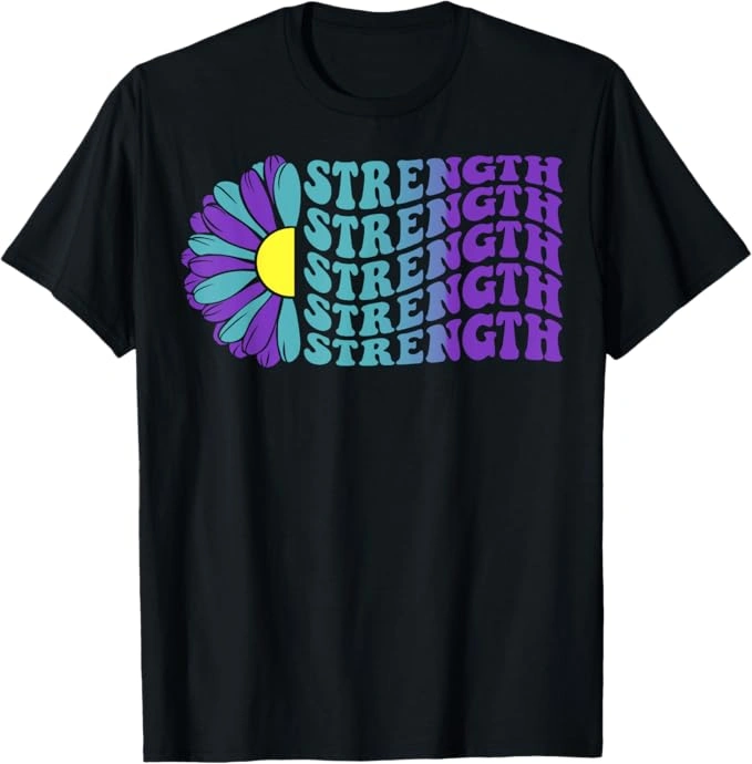 This Strength Sunflower T-Shirt is a wearable statement of resilience, courage, and advocacy for suicide prevention awareness. Designed in the official awareness colors teal and purple, paired with a bold retro 70s wavy font and sunflower design, this shirt embodies the message that strength is found even in the toughest times.